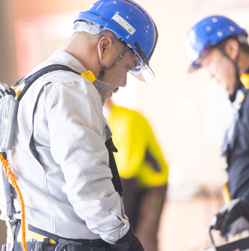 最大の魅力は、強固なチームワークを基盤とした社風にあります。鉄塔塗装は常に危険を伴う作業のため、安全確保を最優先としています。作業前の綿密なミーティングでリスクを共有し、対策を徹底。東昭こすもでは「全員作業で安全確保。全員無事帰宅」をスローガンに掲げ、一人ひとりが仲間の安全を深く意識しています。この強い結束力が、質の高い作業と社員の安心に繋がっています。